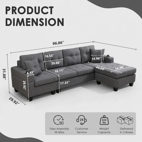 Sectional Sofa Couch, Modern 4-Seaters Living Room Furniture Sets with Reversible Chaise Lounge & 2 Pillows L Shape Couch